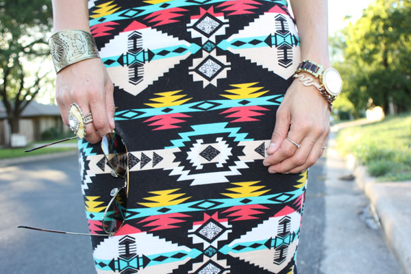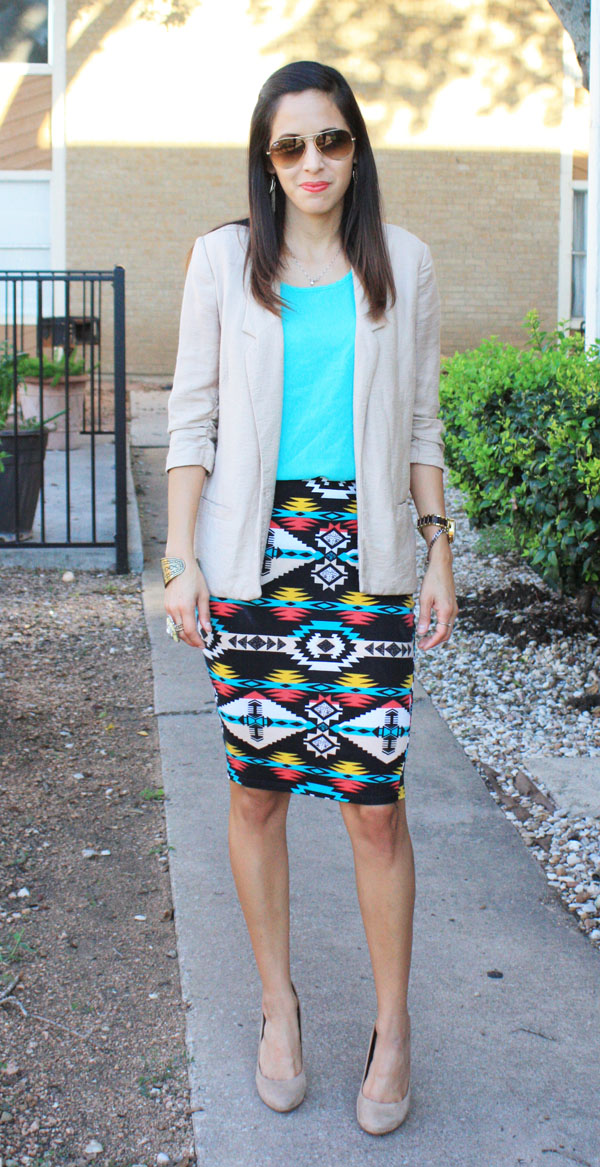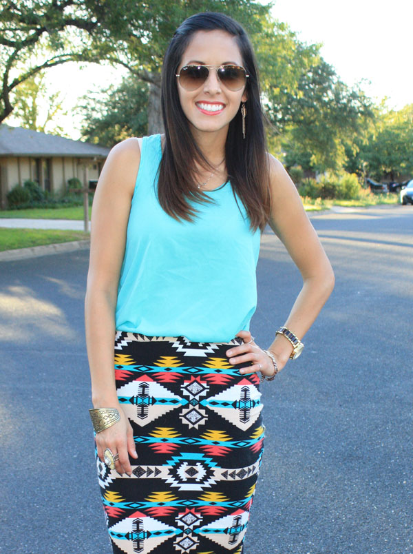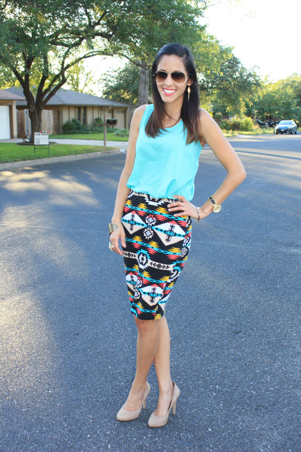I love the pattern of this long pencil skirt. I purchased it at Ross and paired it with a matching turquoise tank top from Marshalls. My Native American inspired bracelet from Forever 21 went perfectly with the pattern of the skirt. To make this a more workday outfit I threw on my Lauren Conrad blazer from Kohls. I think that pumps work best with these longer skirts to help elongate your body. My nude pumps are BCBGMaxazria.