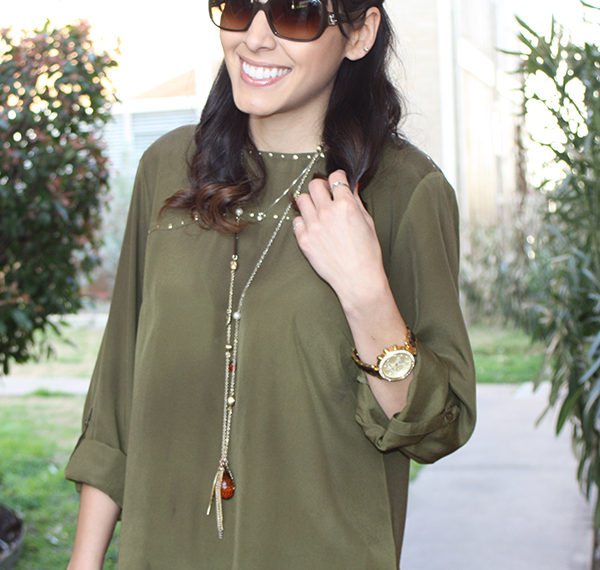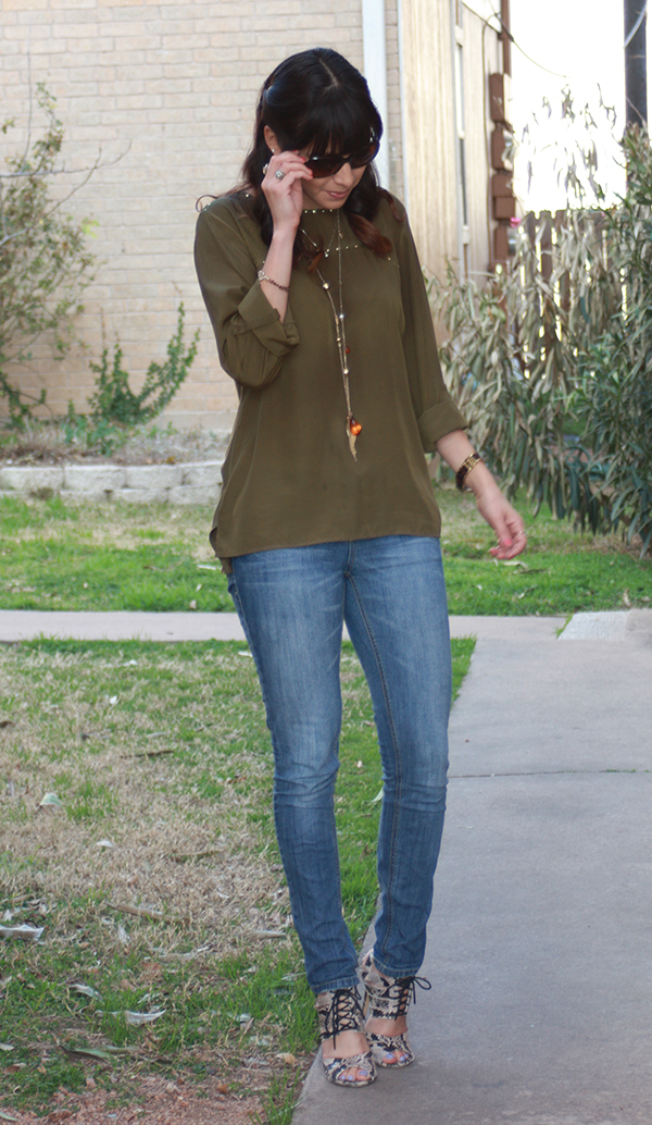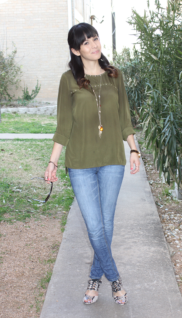 This is one of my casual Friday outfits for work. This shirt was $4.00 at Ross! I purchased my jeans from Target and the necklace from Charming Charlie. My favorite part of this outfit is my shoes! These babies are from ShoeMint and are surprisingly comfortable. The snake bracelet is from Bauble Bar and my sunglasses are Bulgari.