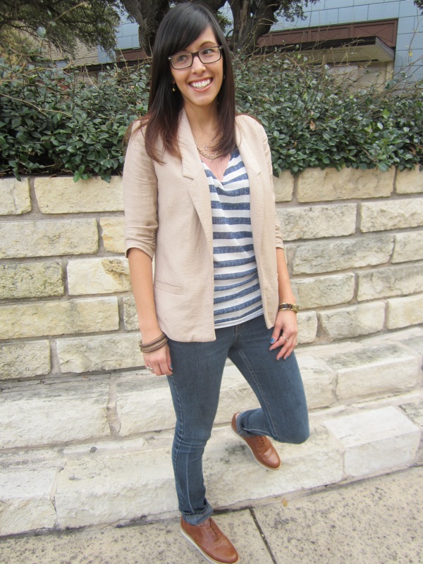 This outfit is what I wore to Butler Park Pitch and Putt in Austin. Even after a couple of near death incidents it was still a good time. It’s BYOB and they allow leashed dogs! Both my plaid pink shirt and gray sweater are from Ross. These skinny jeans are Levi and my black oxford lace shoes are from A’GACI. I combined two pearl necklaces to make it more chunky and stand out.