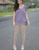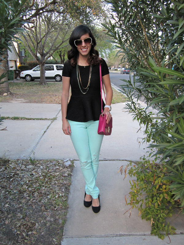 The jean shirt is baaaccckk. Like I said I love this shirt because you can make a lot of great outfits from it. I purchased this one from Marhsalls. My beige corduroy pants and Jessica Simpson sunglasses are from Marshalls as well. I bought the spring floral scarf recently from JcPenny. And to finish accessorizing this spring time outfit are my Charming Charlie pumps and purse.