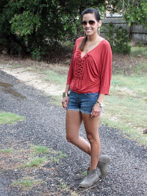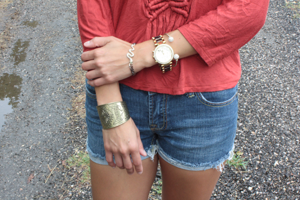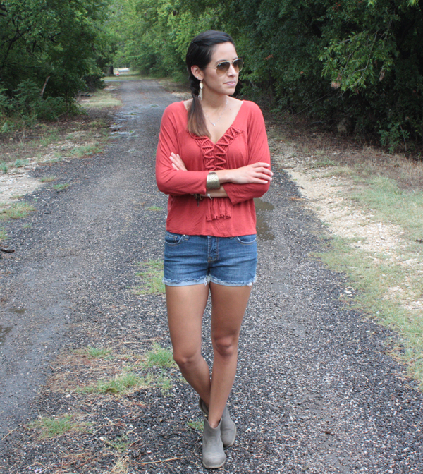 As for the rest of the outfit my jean shorts were purchased on sale at Nordstrom Rack. My tribal inspired cuff bracelet is from Forever 21 and the feather earrings are from Charming Charlie. My booties were a great find at Ross.