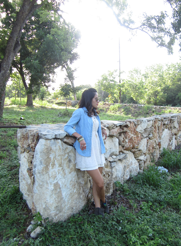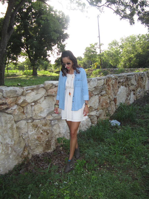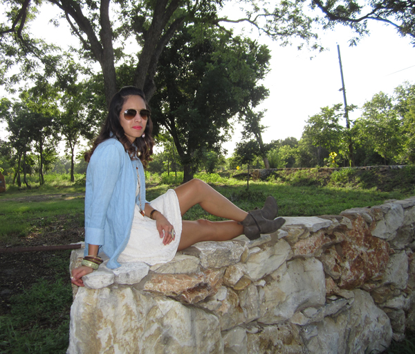The jean shirt is baaaacckkkk. Like I’ve said before, there are so many things you can do with this piece. This time I went with a country cutie look. This blog features my new booties – which I found on sale at Ross. The cream lace dress and the jean shirt were purchased from Marshalls. The long chain necklace is from Charming Charlie.