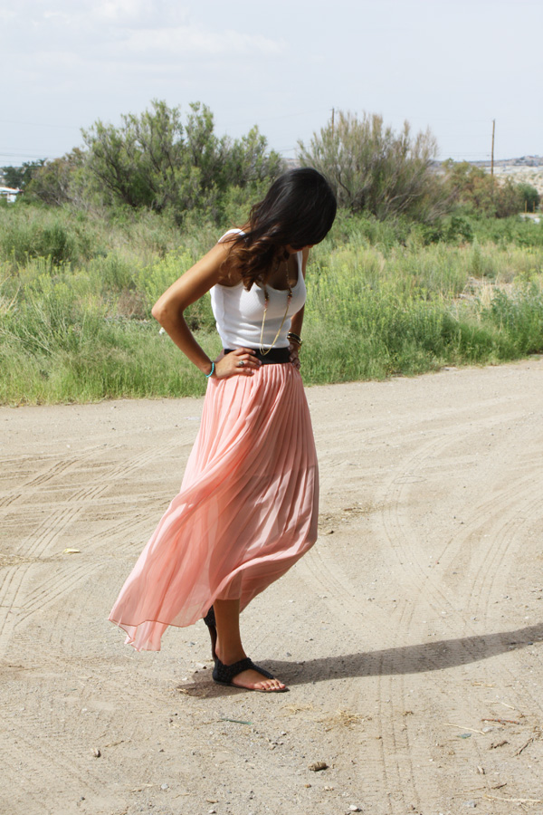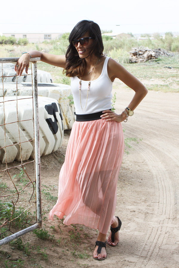 This last weekend I was in El Paso celebrating my grandparents 56 wedding anniversary… I know that’s incredible.  Because the celebration was held outside I wore this light and flowing pink maxi skirt that I purchased at Ross.  I paired it with a white tank top to keep it fresh looking.  My pink and gold necklace and cat eye sunnies are from Charming Charlie.  The turquoise love bracelet and snake bracelet were purchased from the Bauble Bar.  My black sandals are from Candies at Khol’s.