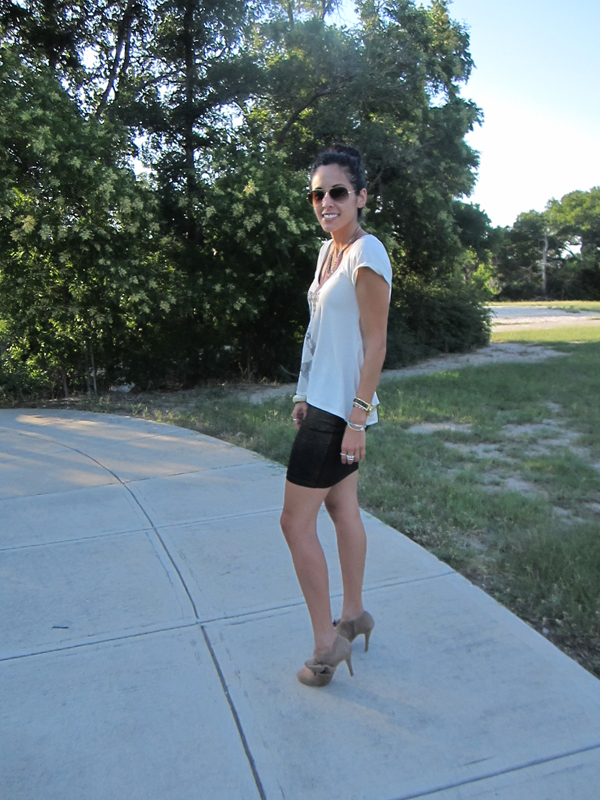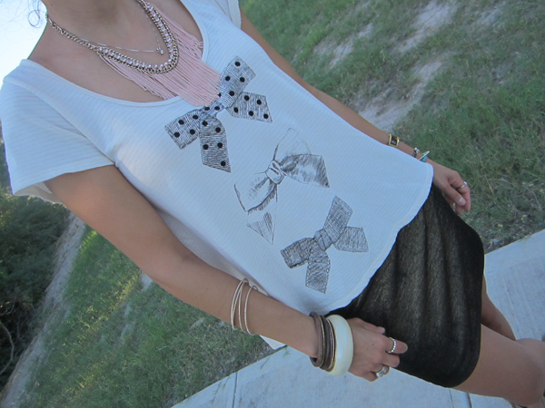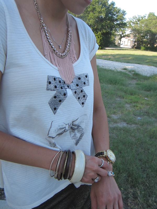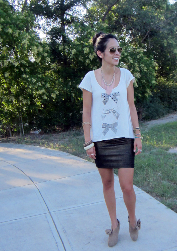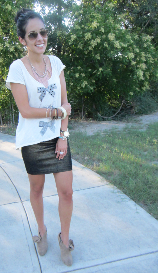 This is a little more of funkier look than I usually go for. My gold skirt and pink fringe necklace are from Forever 21. The bow shirt is from Charming Charlie. My snake bracelet is from the Bauble Bar and my gold ball end cuff bracelet is from Charming Charlie. The bangles are from Payless. These beige booties are actually borrowed but you can get similar ones from Charlotte Russe.