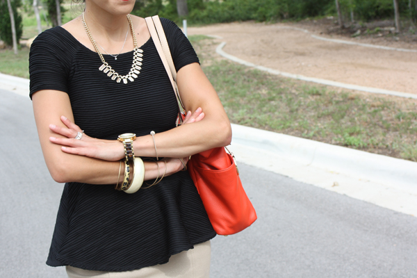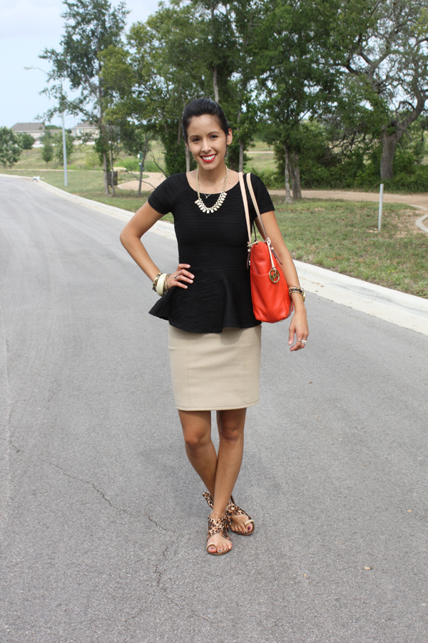 This outfit was inspired by these awesome leopard sandals. I love the bow detail and that they are really comfortable. I purchased them at a fun boutique in Roanoke called Plaid Peacock. The beige pencil skirt was purchased on sale from Forever 21. I paired it with my black peplum top from Zara. The gold statement necklace was a present so not sure where it is from but I thought it was perfect to bring together the black and beige. My Michael Kors tote added the perfect pop of color.