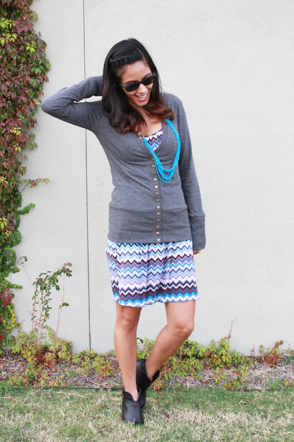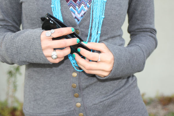 You might recognize this dress that I used in a previous post last fall, http://bit.ly/HtXvAS. The dress is from Charming Charlie and I paired it with this extremely soft gray sweater from Ross. These black booties are now my favorite go to shoes. I purchased them at a great price from Ross. My turquoise necklace is also from Charming Charlie and my double circle ring is from Bauble Bar. And of course for an outfit to be complete I have to have sunnies. These are RayBan wayfarers.