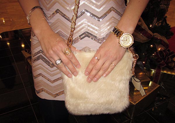 If your ever on a budget and need a nice dress, Ross is the place to go! I found this dress on sale this summer and finally had a chance to bring it out. I wore it to my office Holiday Party. I paired it with black tights from Target and black Nine West pumps. Just to make this outfit even more over the top I pulled out my fur cross body purse from Charming Charlie.