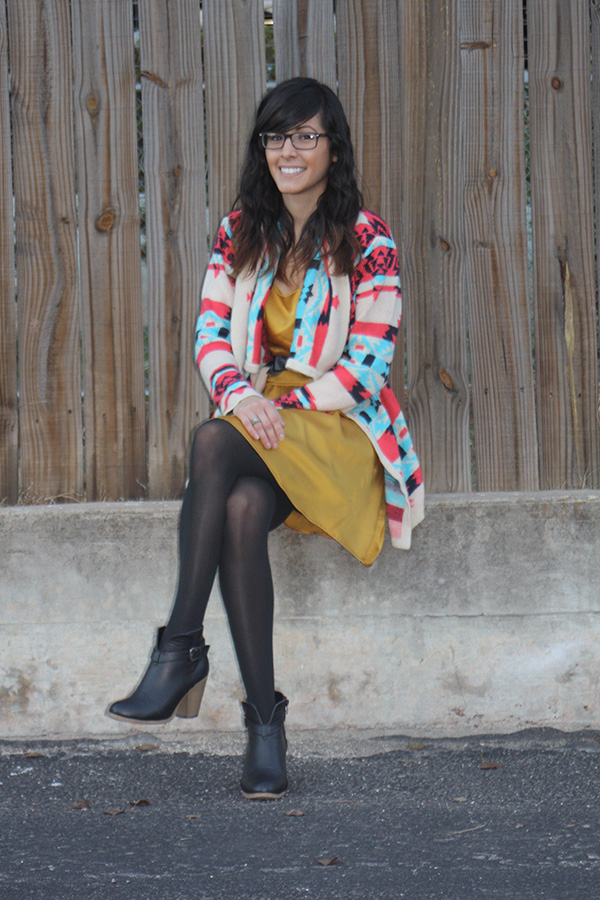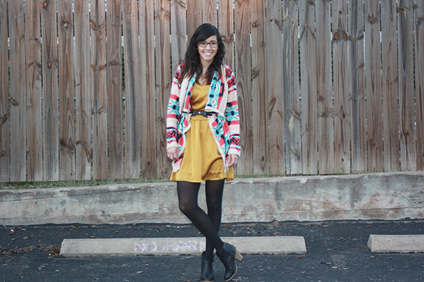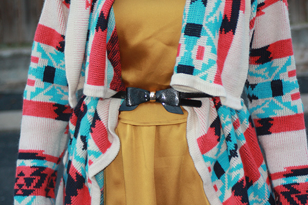 One aspect I love about fashion is that you get to wear your creativity. I have used both the dress and sweater in separate posts before. The only thing that is new is the black bow belt. My cozy tribal print sweater is from Ross and I paired is with the mustard yellow dress that I purchased at Le Garage Sale. The black booties and black bow belt (originally came with another shirt) were purchased at Ross as well.