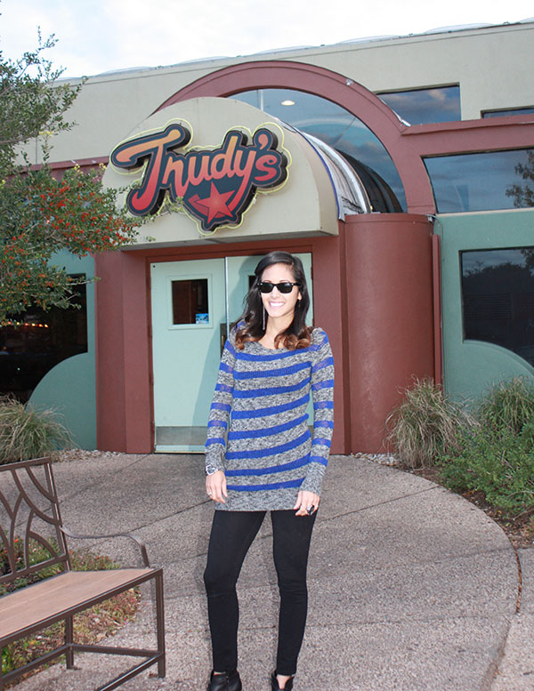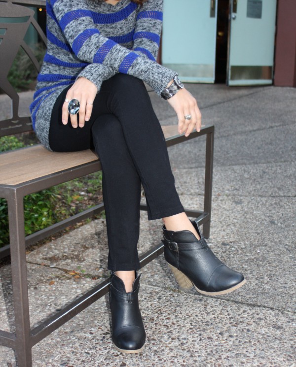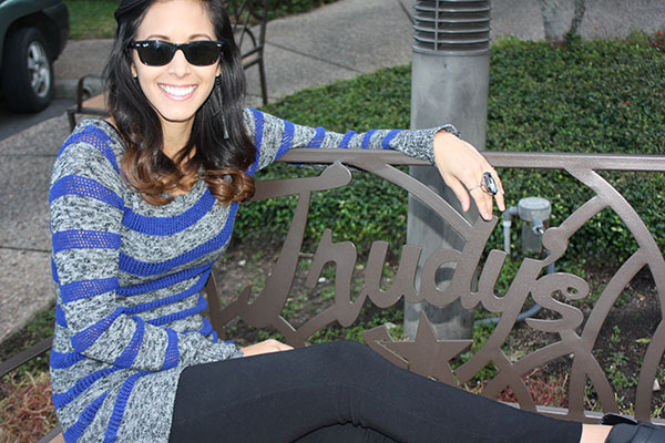 This outfit is what I wore to one of my favorite restaurants here in Austin. Trudy’s is famous for their Mexican Martini. I’m also a big fan of their stuffed avocado plate and weekend brunch… omnomnom. This blue and black tunic is from Marshalls as are the black skinny pants. My black booties are from Ross… and yes I know they were in my last post and will be in the next one. What can I say? They are my new favorite shoes! My giant black oval ring is from Forever 21 and my sunnies are Raybans.